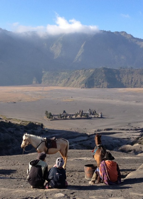 Es sieht aus wie auf dem Mond. Mit Sicherheit nicht, wie man sich Indonesien so vorstellt. Vor uns liegt eine riesige Caldera mit bestimmt 10km Durchmesser, gefüllt mit feinem Vulkansand, die Lautan Pasir oder “Sea of Sand”. Das allein wäre schon spektakulär genug, doch es ragen noch weitere Vulkane aus der Sea of Sand empor – und sie sind zum Teil aktiv, wie der Bromo, dessen Spitze bei einem früheren Ausbruch abgesprengt wurde. In der Ferne entdecke ich im Sandmeer das einsame Kloster Pura Luhur Poten – genutzt von den Tengger, einem der wenigen verbleibenden Hindu-Volksstämme auf Java (das ansonsten ja muslimisch ist). Da will ich hin.